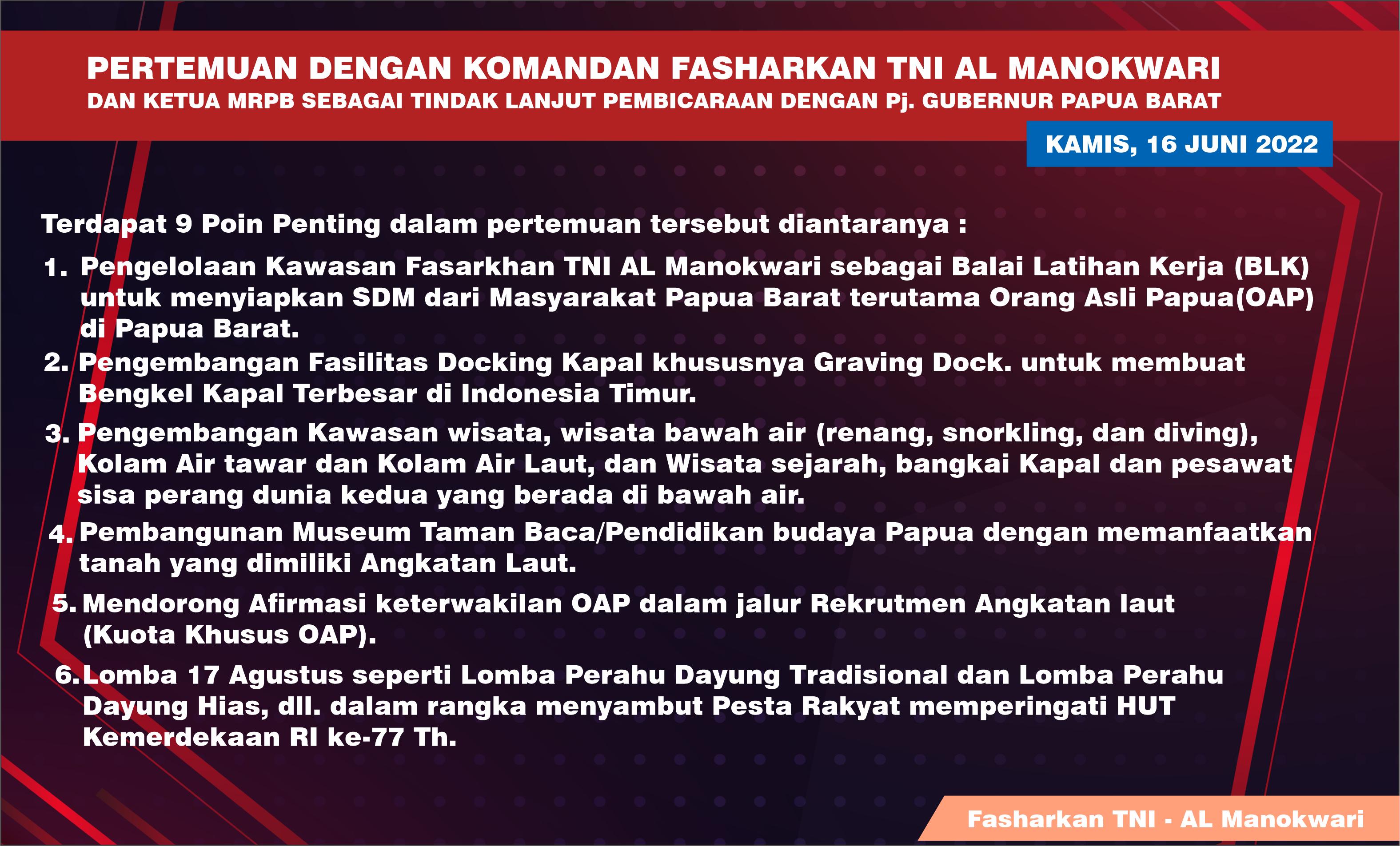 Pertemuan dengan Komandan Fasharkan TNI AL Manokwari dan Ketua MRPB Sebagai Tindak Lanjut Pembicaraan dengan Pj. Gubernur Papua Barat
