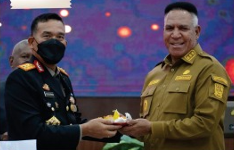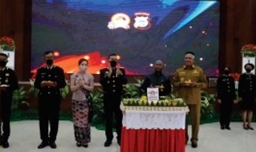 Penjabat (Pj) Gubernur Papua Barat, Komjen (Purn) Drs Paulus Waterpauw menerima tumpeng dari Kapolda Papua Barat, Irjen Pol Daniel Tahi Monang Silitonga dalam perayaan HUT ke-76 Bhayangkara, karena berjasa dalam merintis Polda Papua Barat.